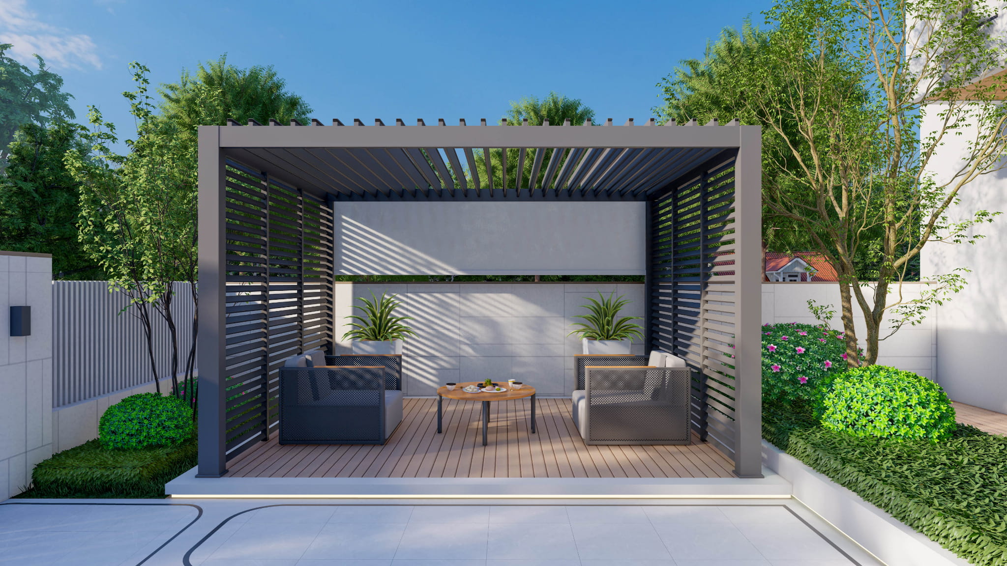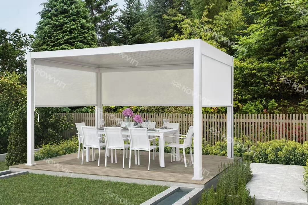 Uwaga: Przedstawiona cena obejmuje samą pergolę w wersji bazowej. Ścianki boczne oraz rolety widoczne na fotografiach stanowią wyposażenie dodatkowe, które możesz dokupić oddzielnie w naszym sklepie.
